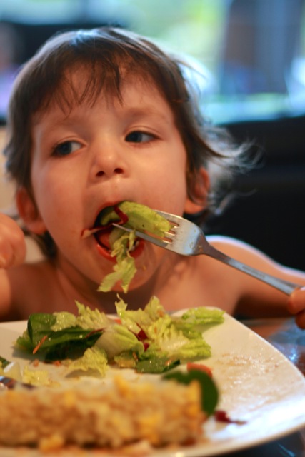 Jake: Tackling a salad with an adult size fork and knife is a great effort. Just one of his many ways that he is exerting his independance and insisting on “I do it!”