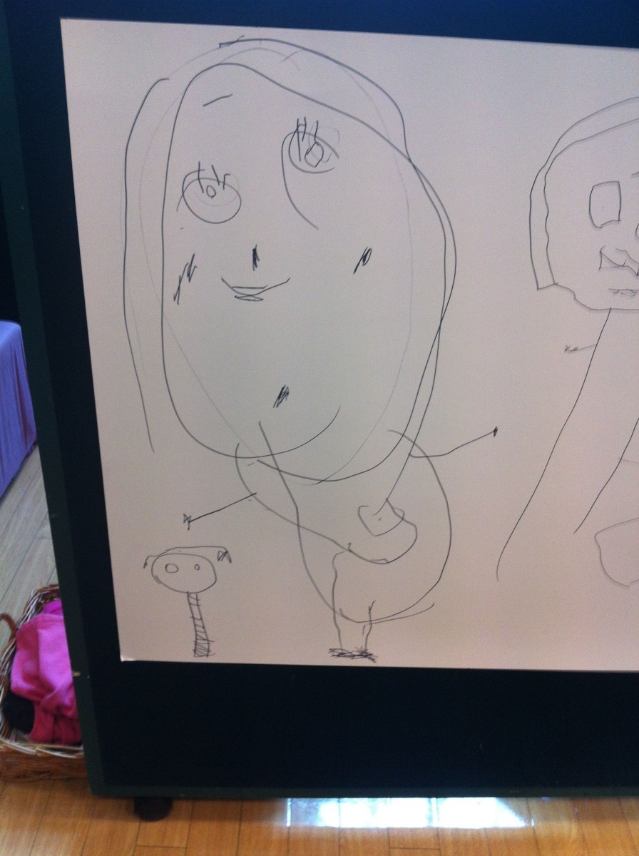 Evie: This week’s portrait is one that she drew at kinder (self-titled “girl and boy”). It is fascinating to watch the progression of her stick figure people as they develop with more detail in each drawing.