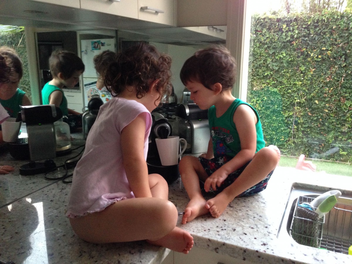 Together: My husband and I need our early morning coffee fix as soon as we wake up the kids wake us. Jake and Evie love to help with the prepraration and big debates are held over who inserts the coffee pod and who gets to froth the milk.